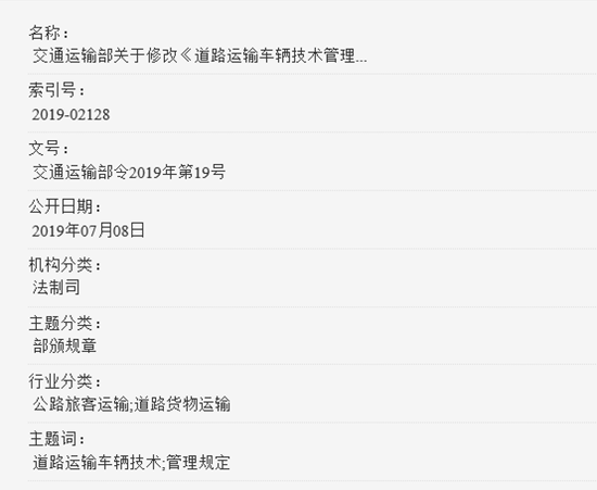 《交通运输部关于修改〈道路运输车辆技术管理规定〉的决定》已于2019年6月12日经第12次部务会议通过,现予公布,自公布之日起施行。