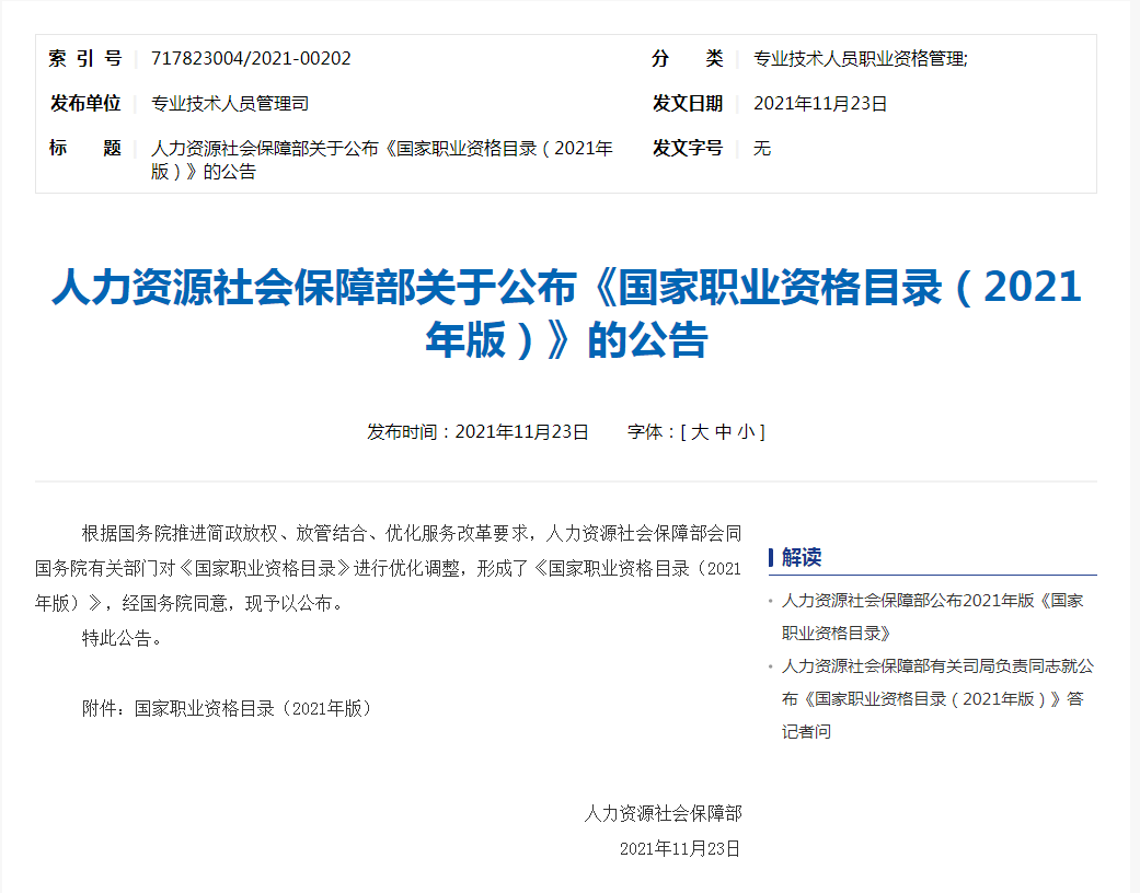 人力资源社会保障部关于公布《国家职业资格目录(2021年版)》的公告