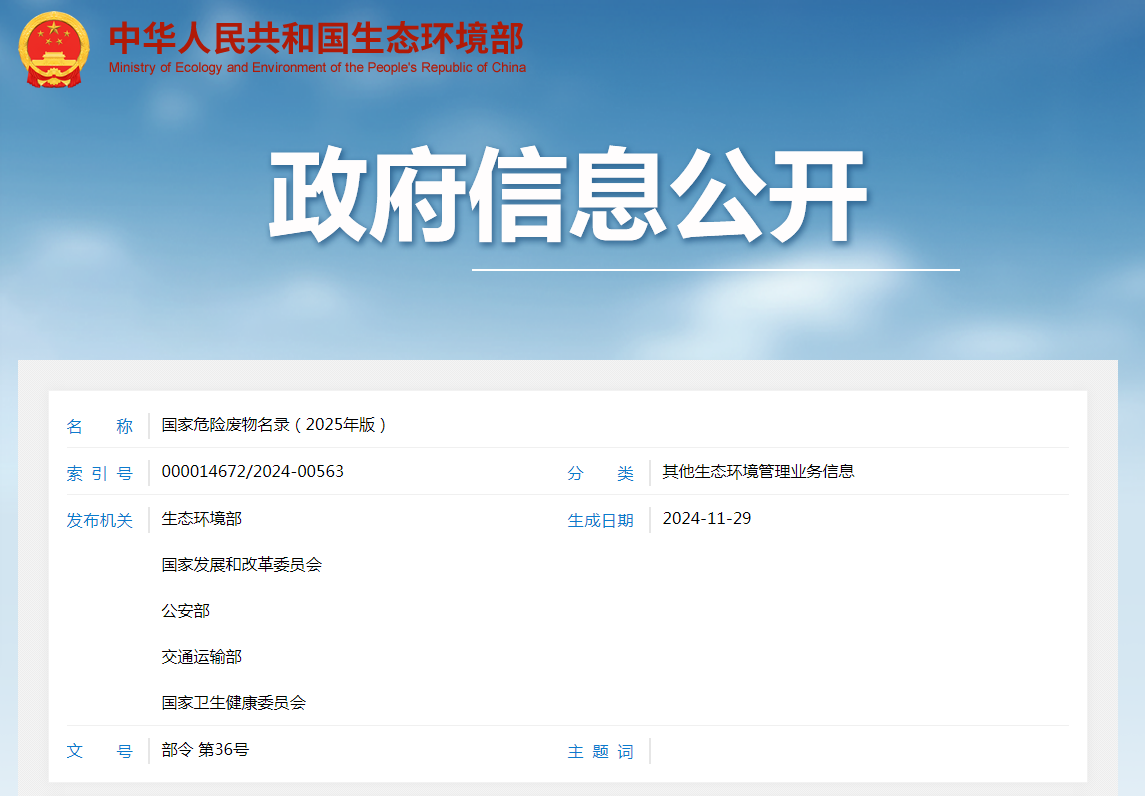 《国家危险废物名录(2025年版)》已于2024年11月8日由生态环境部2024年第5次部务会议审议通过,并经国家发展改革委、公安部、交通运输部、国家卫生健康委同意,现予公布,自2025年1月1日起施行。